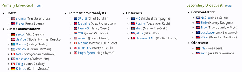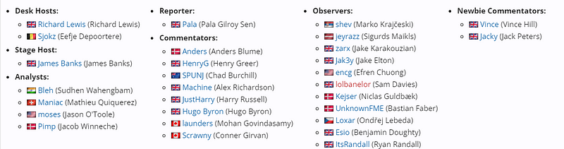 We can also go through the various tier 2 and tier 3 tournaments and ignoring the exceptions which was ESL Challenger Melbourne. A large amount of the casters were from Europe or North America.