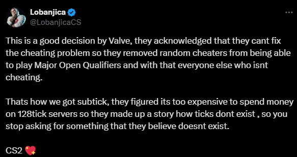 It doesn’t say since we can’t manage the cheating issue therefore we have banned open qualifiers. As kassad tweeted, “Doesn’t Valve realise that cheaters are playing at all the events that gets them points on their rankings?”.